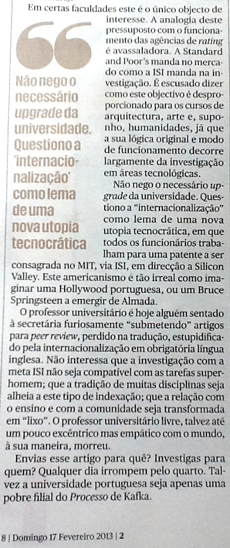 Mercado total, oportunidade de negócio, ultraliberalismo, individualismo, rankings, meritocracia, internacionalização e globalização da língua, e podíamos estar um bom tempo a debitar termos que infernizam as sociedades actuais e, é bom que se sublinhe, a que as crianças não escapam. Não podemos dizer que não fomos avisados e só temos que nos penalizar por termos considerado os avisadores como gente pouco competitiva.