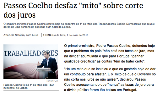 Passos Coelho disse hoje que estava a desfazer o mito de que os juros da dívida (a fatia maior foi feita pela banca e por privados "encostados" às empresas públicas) não descem porque o Governo não quer. Mas que mito é esse? Nunca ouvi tal coisa. Os juros são obras dos credores (os de dentro, os de fora e os intermediários), Passos Coelho estava de acordo e até para além da troika.