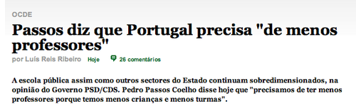 Por mais que se saiba que a redução da natalidade está ainda longe de influenciar o número de alunos no curto e no médio prazos, que houve um aumento do número de alunos por turma associado à redução curricular e a uma gestão escolar única no mundo conhecido, que temos ainda uma percentagem, que nos envergonha, de pessoas que não concluem o ensino secundário e mesmo o 3º ciclo, o primeiro-ministro faz estas afirmações na linha das conclusões do indizível relatório FMI.