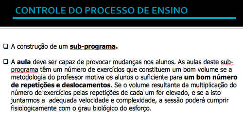 Detalhei três metodologias do processo de ensino em EDF: por blocos, por etapas e misto. Apresentei, de forma sucinta, um sub-programa que comecei a construir em 1993 e que explica as opções didácticas a partir dos programas em vigor. Salientei, no slide seguinte, um parágrafo deste subprograma que me parece lapidar.