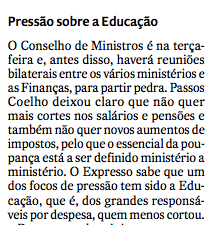 O Governo prepara-se para anunciar mais cortes. Um dos jornais mainstream, o Expresso, não olha a meios para apontar a Educação como o alvo prioritário.