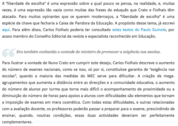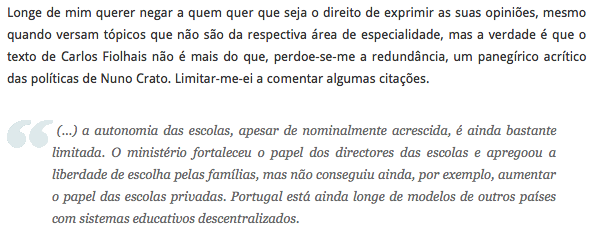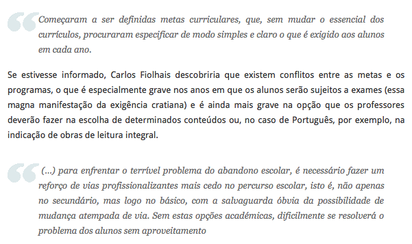 O professor e blogger fez, em 26 de Novembro de 2012, uma crítica detalhada às opiniões de Carlos Fiolhais. O melhor é ir ler o post, mas fiz umas imagens das passagens mais significativas que deixo à reflexão. É muita mudança no pensamento estrutural em tão pouco tempo que vai do reforço do ensino privado à gestão escolar e passando, ao que parece, pelo ensino dual; enfim.